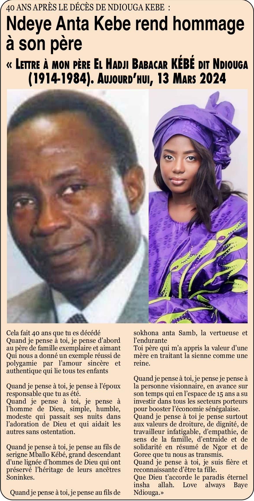 Quand je pense à toi, je suis fière et reconnaissante d’être ta fille. Que Dieu t’accorde le paradis éternel insha allah. Love always Baye Ndiouga.