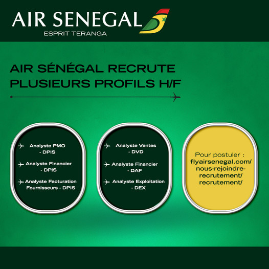 La compagnie aérienne Air Sénégal recrute plusieurs profils :- Analyste PMO – DPIS- Analyste Financier – DPIS- Analyste Facturation Fournisseurs – DPIS- Analyste Exploitation – DEX- Analyste Ventes – DVD- Analyste Financier – DAF Suivez ce ce lien (https://flyairsenegal.com/nous-rejoindre…/recrutement/ ) pour avoir toutes les informations afin de pouvoir postuler en ligne aux offres d’Air Sénégal.