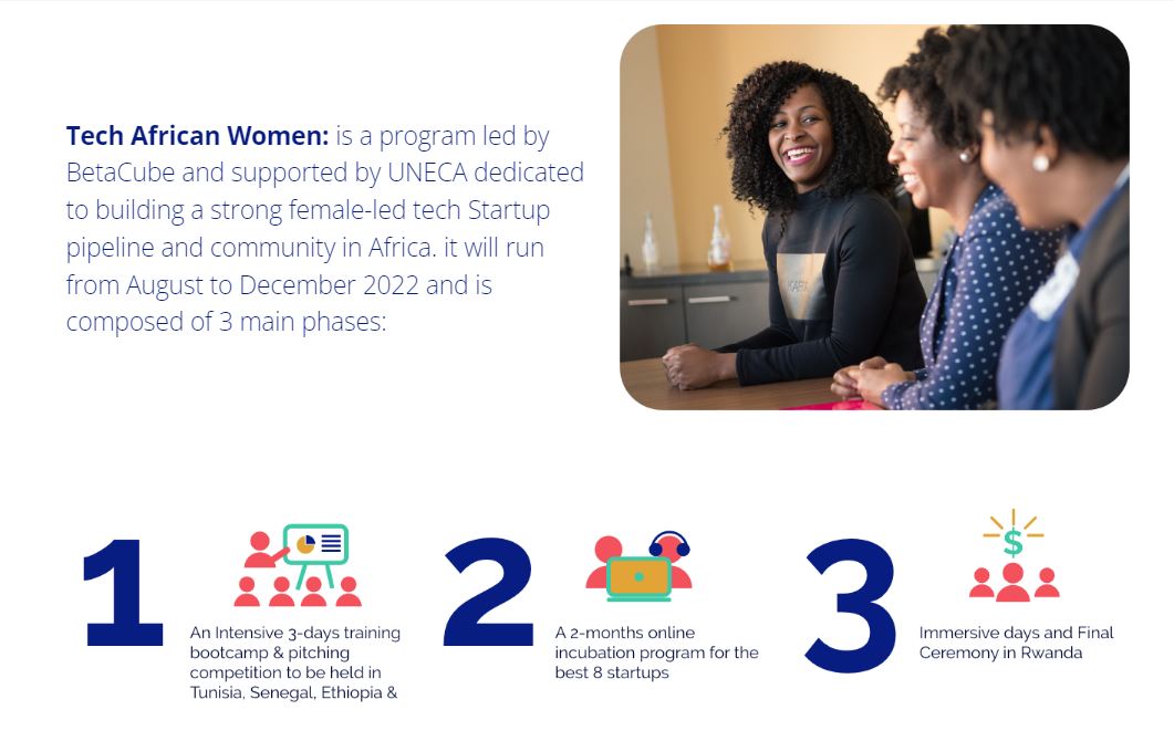 UNECA (United Nations Economic Commission for Africa), en partenariat avec Betacube, annonce le lancement du nouveau programme Tech African Women, invitant les startups en phase d’idéation d’Éthiopie, du Sénégal, de Tanzanie et de Tunisie dirigées par des femmes à soumettre leurs candidatures.