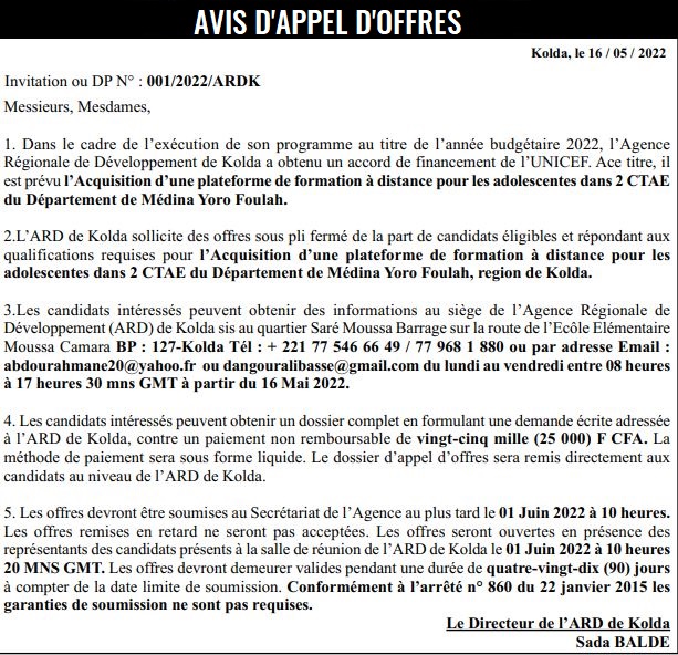 2.L’ARD de Kolda sollicite des offres sous pli fermé de la part de candidats éligibles et répondant aux qualifications requises pour l’Acquisition d’une plateforme de formation à distance pour les adolescentes dans 2 CTAE du Département de Médina Yoro Foulah, region de Kolda.