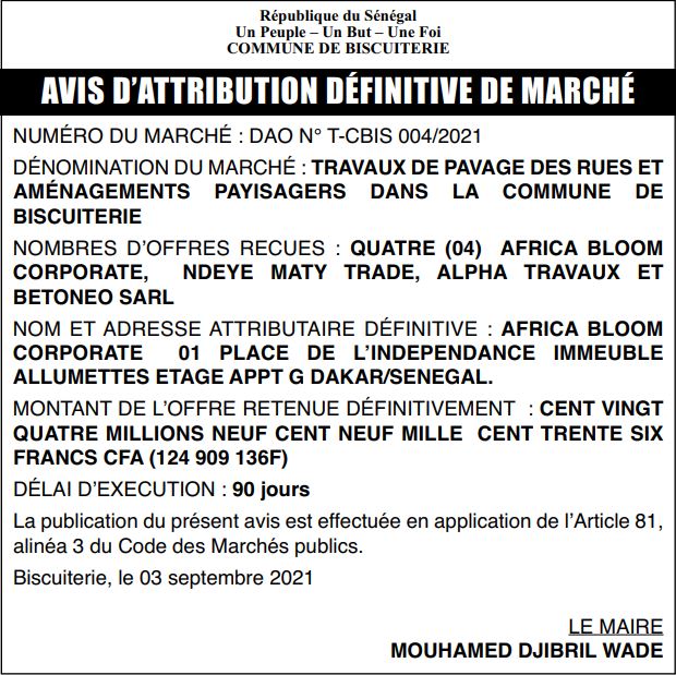 NUMÉRO DU MARCHÉ : DAO N° T-CBIS 004/2021 DÉNOMINATION DU MARCHÉ : TRAVAUX DE PAVAGE DES RUES ET AMÉNAGEMENTS PAYISAGERS DANS LA COMMUNE DE BISCUITERIE NOMBRES D’OFFRES RECUES : QUATRE (04) AFRICA BLOOM CORPORATE, NDEYE MATY TRADE, ALPHA TRAVAUX ET BETONEO SARL NOM ET ADRESSE ATTRIBUTAIRE DÉFINITIVE : AFRICA BLOOM CORPORATE 01 PLACE DE L’INDEPENDANCE IMMEUBLE ALLUMETTES ETAGE APPT G DAKAR/SENEGAL. MONTANT DE L’OFFRE RETENUE DÉFINITIVEMENT : CENT VINGT QUATRE MILLIONS NEUF CENT NEUF MILLE CENT TRENTE SIX FRANCS CFA (124 909 136F) DÉLAI D’EXECUTION : 90 jours La publication du présent avis est effectuée en application de l’Article 81, alinéa 3 du Code des Marchés publics. Biscuiterie, le 03 septembre 2021