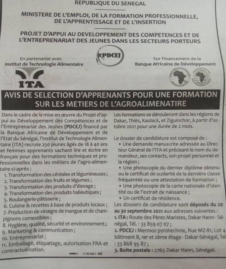 Avis de sélection d’apprenants pour la formation sur les métiers de l’ agroalimentaire