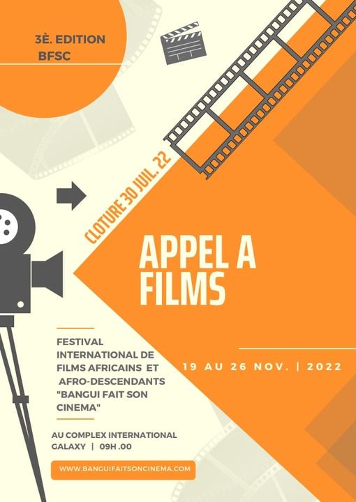 [ APPEL À FILMS ] La 3ème édition du Festival International « Bangui Fait Son Cinéma se tiendra le 19 au 26 Novembre 2022 à Bangui en République Centrafricaine. Association ACPAD et le comité de sélection officielle lancent le dernier appel à films à l’endroit des Cinéastes : Réalisateurs, Producteurs, Distributeurs.. le festival vous offre cette opportunité jusqu’au fin Juillet 2022.Durant 08 jours, la grande capitale Bangui, ville de pari va vibrer au rythme du cinéma Africains et Afro-descendants avec des concerts et divers spectacles à l’ouverture, des rencontres professionnelles, des conférences débats autour de la thématique choisit pour cette édition « Un Avenir en Commun » et un diner de gala à la clôture. Soumettre votre candidature :