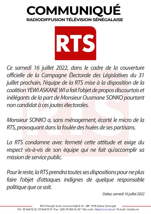 Ce samedi 16 juillet 2022, dans le cadre de la couverture officielle de la Campagne Électorale des Législatives du 31 juillet prochain, l’équipe de la RTS mise à la disposition de la coalition YEWWI ASKAN WI a fait l’objet de propos discourtois et inélégants de la part de Monsieur Ousmane SONKO pourtant non candidat à ces joutes électorales.
