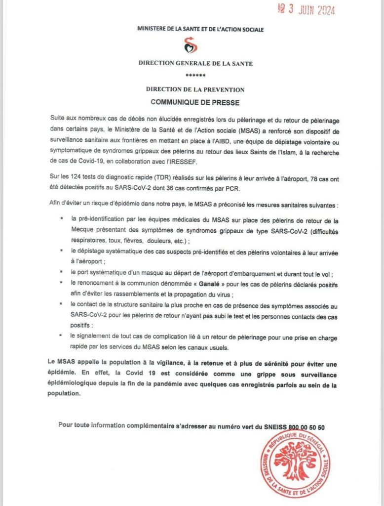 Suite aux nombreux cas de décès non élucidés enregistrés lors du pèlerinage et du retour de pèlerinage dans certains pays, le Ministère de la Santé et de l’Action sociale (MSAS) a renforcé son dispositif de surveillance sanitaire aux frontières en mettant en place à l’AIBD une équipe de dépistage volontaire ou symptomatique de syndromes grippaux des pèlerins au retour des lieux Saints de l’Islam, à la recherche de cas de Covid-19, en collaboration avec l’IRESSEF.