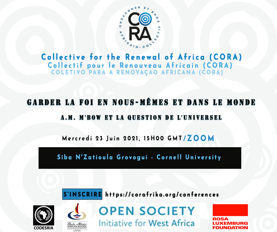 Le Collectif pour le Renouveau Africain (CORA) organise un webinaire le 23 juin 2021 à 15h GMT pour discuter des idées de l’ancien directeur général de l’UNESCO, Amadou Mahtar M’Bow ainsi que sa contribution aux débats sur la gouvernance globale :