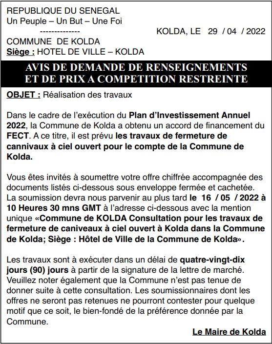 Vous êtes invités à soumettre votre offre chiffrée accompagnée des documents listés ci-dessous sous enveloppe fermée et cachetée. La soumission devra nous parvenir au plus tard le 16 / 05 / 2022 à 10 Heures 30 mns GMT à l’adresse ci-dessous avec la mention unique «Commune de KOLDA Consultation pour les travaux de fermeture de caniveaux à ciel ouvert à Kolda dans la Commune de Kolda; Siège : Hôtel de Ville de la Commune de Kolda».