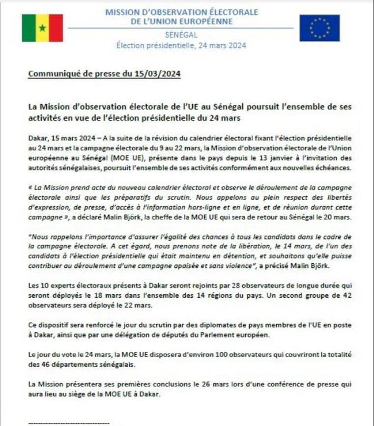 La Mission d’observation de l’UE poursuit l’ensemble de ses activités en vue de la présidentielle