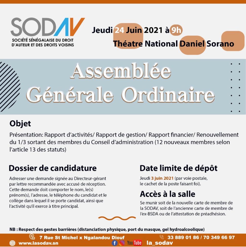 Assemblée générale ordinaire au Theatre National Daniel Sorano Jeudi 24 Juin 2021 à 9 heures