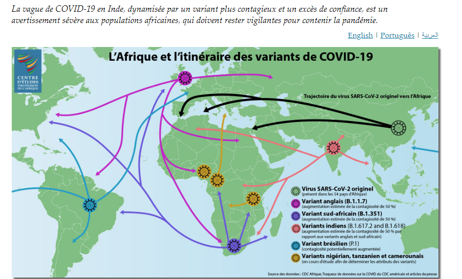 Les pays d’entrée , tels que l’Égypte, l’Algérie, le Maroc et l’Afrique du Sud ont des niveaux de commerce international, de voyages, de tourisme et de trafic portuaire parmi les plus élevés du continent. Cela fait qu’ils sont plus exposés à des variants potentiellement plus infectieux et mortels, qui ont émergé dans d’autres régions du monde telles que l’Inde. Les interconnexions entre l’Asie du Sud et le continent africain sont mises en lumière par la détection précoce du variant indien en Algérie, au Maroc et en Afrique du Sud.