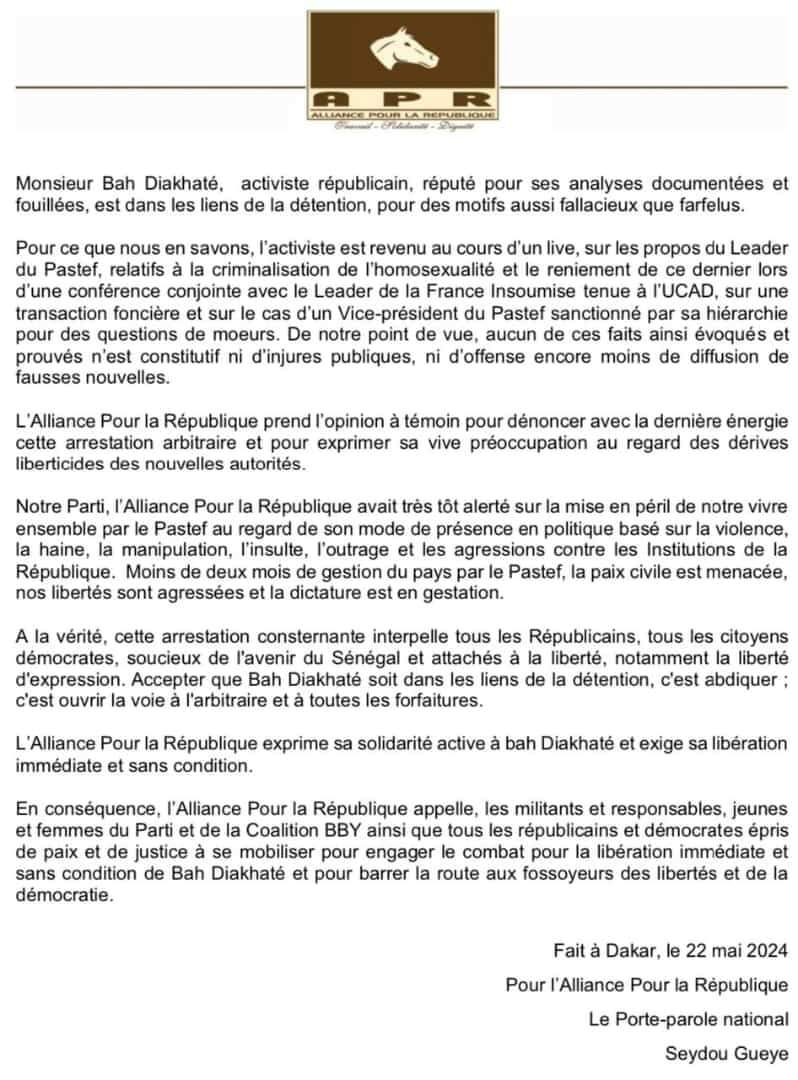 L’Apr exige la libération immédiate de Bah Diakhaté
