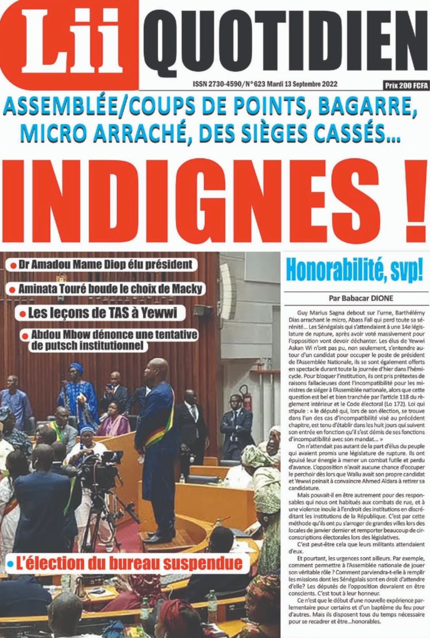 C’était ‘’la chienlit’’ à l’Assemblée nationale, selon L’Info. Le Témoin parle de ‘’débuts chaotiques’’ de la 14e législature avec des députés qui ont offert ‘’un spectacle affligeant’’. ‘’Les heurts sombres de la démocratie’’, selon L’Observateur. ‘’Début de l’hémicirque’’, titre Le Quotidien qui relève que les députés Guy Marius Sagna (Yewwi) et Barthélémy Dias (Yewwi) ‘’se donnent en spectacle’’. Le journal souligne qu’Amadou Mame Diop, élu président de l’Assemblée sous la ‘’supervision’’ des gendarmes, a été ‘’la surprise’’ de Macky Sall.
