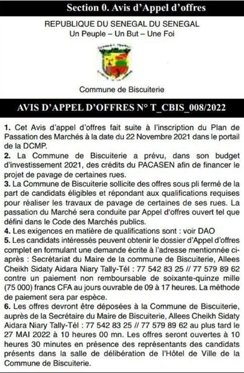 6. Les offres devront être déposées à la Commune de Biscuiterie, auprès de la Secrétaire du Maire de Biscuiterie, Allées Cheikh Sidaty Aidara Niary Tally-Tél : 77 542 83 25 // 77 579 89 62 au plus tard le 27 MAI 2022 à 10 heures 00 mn. Les offres seront ouvertes à 10 heures 30 minutes en présence des représentants des candidats présents dans la salle de délibération de l’Hôtel de Ville de la Commune de Biscuiterie.