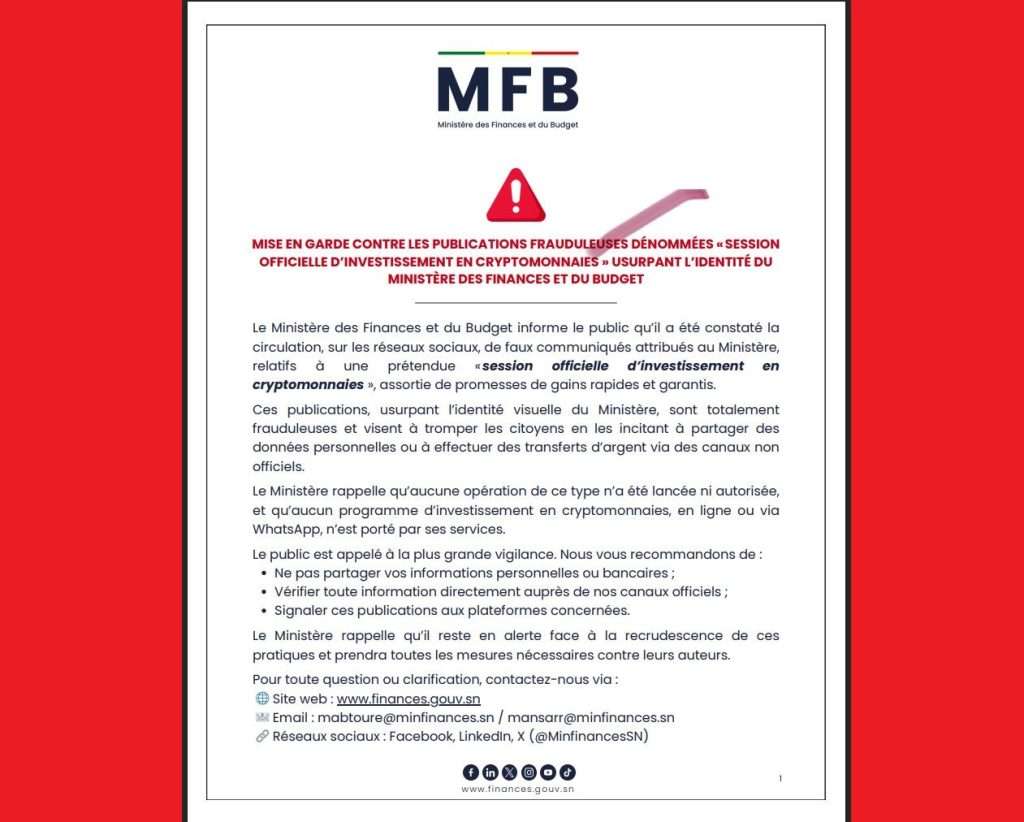 Le Ministère des Finances et du Budget informe le public qu’il a été constaté la circulation,…