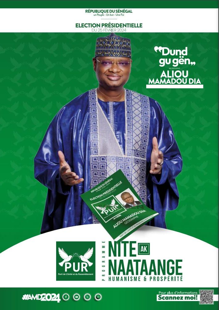 Nous invitons tous les militants, sympathisants et l’ensemble des Sénégalaises et Sénégalais ainsi que la communauté internationale, à s’approprier de ce programme présidentiel du Président Aliou Mamadou DIA, un candidat destiné à tous les citoyens sénégalais et d’ailleurs aspirant à Penser et à Agir pour l’intérêt général et la promotion des valeurs de Paix, d’Unité, d’Equité et de Respect de la Dignité humaine.